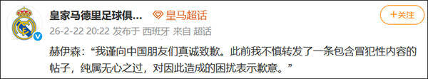 足球直播,欧洲杯直播,体育直播,球客直播,雷速体育,篮球直播,风驰直播,NBA直播,英超直播,足球比分,足球赛事,意甲,欧冠,世界杯,世界杯直播,村超,贵州村超,波胆,角球,串球,大小球@皇家马德里足球俱乐部 2月22日在微博发布赫伊森的道歉内容,称“我谨向中国朋友们真诚致歉。此前我不慎转发了一条包含冒犯性内容的帖子,纯属无心之过,对因此造成的困扰表示歉意”。
